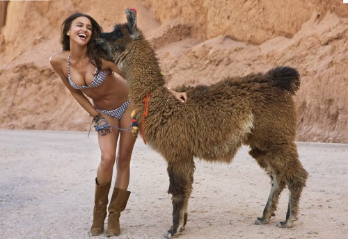 Swimsuit: 2010 Issue: Portrait of Irina Shayk with a llama during photo shoot. Bikini by Letarte by Lisa Cabrinha.